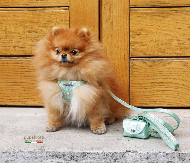 GLAM Swarovski. 3-piece set. Harness and leash with bag holder in leather for dog - Menta / XL-XXL is backordered and will ship as soon as it is back in stock.